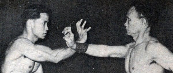 Gong Kiu 'harde brug', toont meester Lam in een zijwaartse Gi Ng Ma (boogstand) met een voorwaartse vuist en een stekende hand achterwaarts.